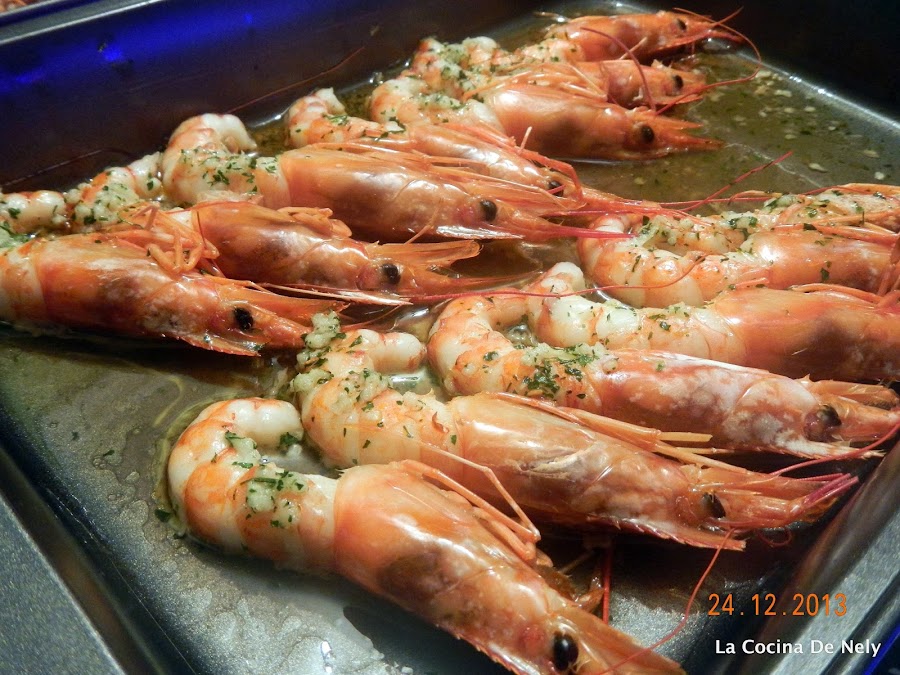 Pelar los gambones dejando la cabeza y ponerlos colorados en una bandeja de horno.