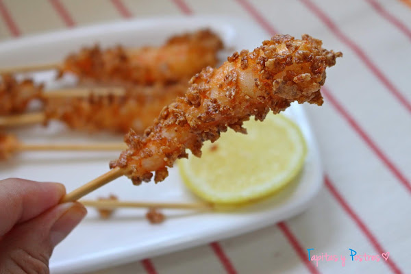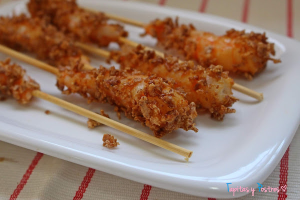 Para una cena informal o para una celebración, porque en una boda este fue uno de los entrantes que ofrecieron. Bueno este no, uno muy parecido jajaja. Esta es mi versión de lo que probé en la boda, muy parecido, yo creo que casi igual, aunque algo me debió faltar en la elaboración porque los originales estaban bien rebozados en cereales y a los míos se les caía. No estoy muy segura pero creo que después de rebozarlos por los cereales, los pasaban por harina...no sé, ya lo investigaré mejor.