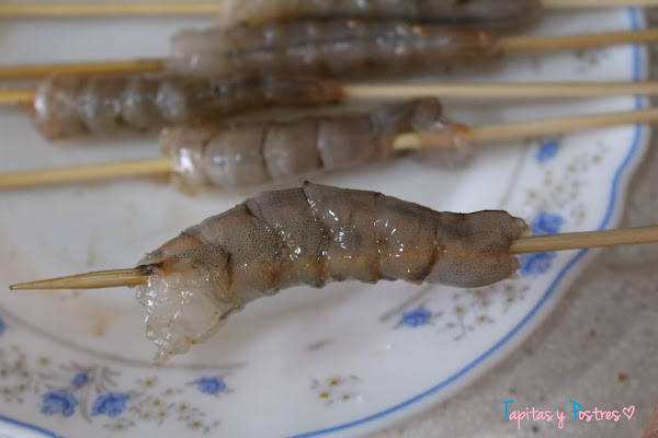 Pelamos los gambones, los salpimentamos y los ensartamos en una brocheta, que queden rectos, no curvos.