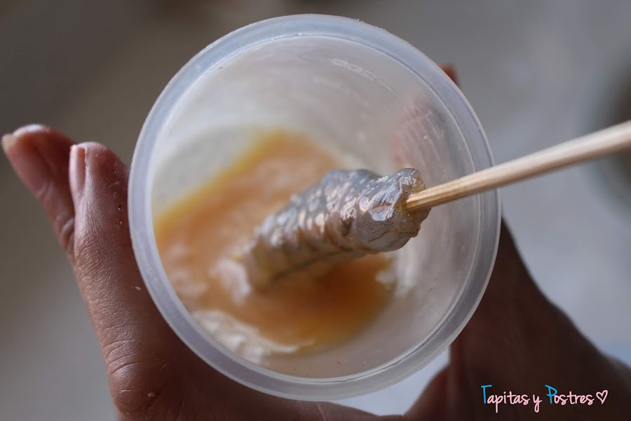 Lo primero es pelar los gambones. Los salpimentamos y ensartamos en un palo de brocheta de forma que quede recto.
