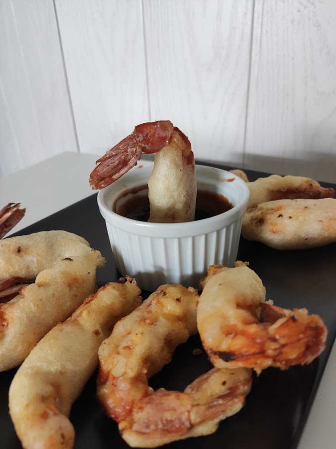 Calentar el aceite y freír las gambas previamente pasadas por la mezcla de tempura.
