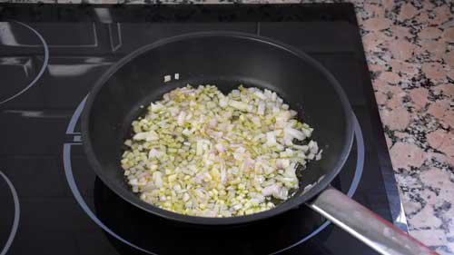 3. Una vez que la cebolla esté transparente, añadimos los tomates secos que hemos hidratados y cortados en trozos también pequeños. Mezclamos y sofreímos por un par de minutos más.