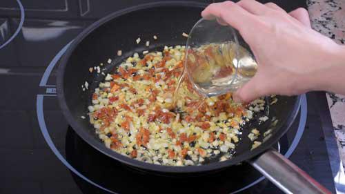 4. Luego, agregamos una copa de vino blanco, en mi caso he usado vino fino de Jerez, pero puedes usar el vino que más te guste.