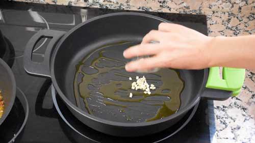 7. En una olla o cacerola aparte, agregamos unas dos o tres cucharadas de aceite de oliva, lo ponemos a calentar a fuego medio y echamos unos dientes de ajo picados. Rehogamos hasta que se doren.8. Una vez que el ajo tome color, subimos el fuego a fuerte y agregamos los gambones. Echamos sal gruesa y los hacemos así a la plancha a fuego alto durante un par de minutos o tres.