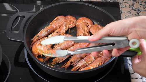 9. Después, le damos la vuelta a los gambones y le echamos un poco más de sal gruesa por este lado. Hacemos los gambones ahora por esta cara a fuego alto durante 2-3 minutos más.