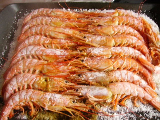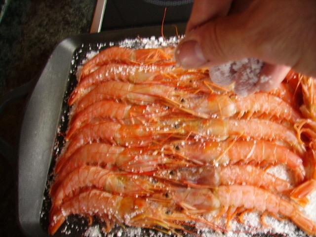 3.- Colocamos los gambones bien situados uno tras otro cubriendo toda la sal.