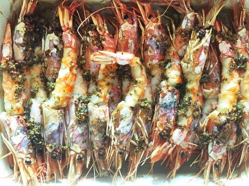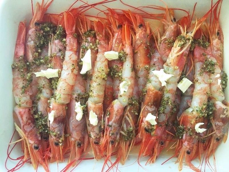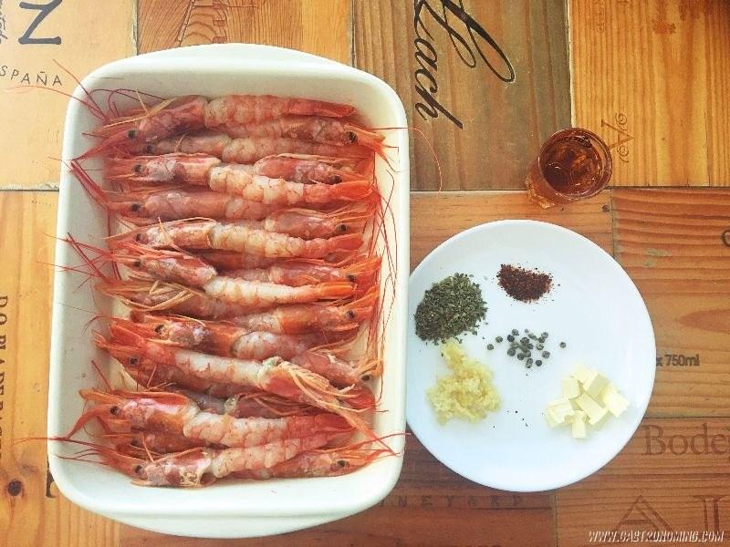 1. Despojamos las “cáscaras” de los cuerpos de los gambones, dejando las cabezas y las colas intactas y los colocamos ordenadamente sobre una bandeja para horno. Reservamos.