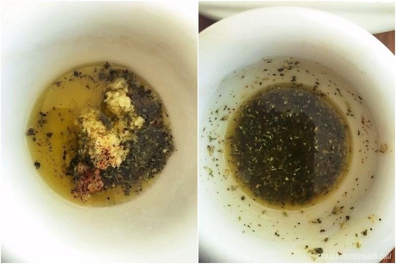 2. En un mortero colocaremos los granos de pimienta verde (si no tienes pimienta verde puedes usar pimienta negra, también que da bien) y los rompemos, añadiremos los ajos, orégano y el aceite de oliva para machacar bien y hacer el majado con el que aderezaremos los gambones.