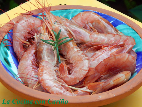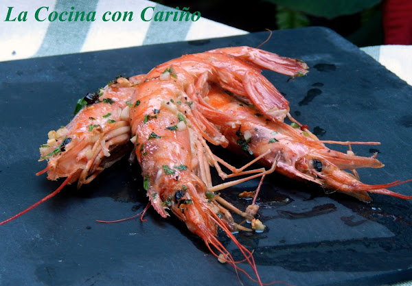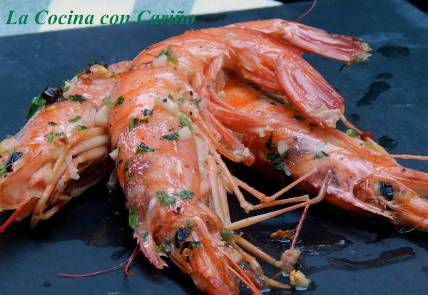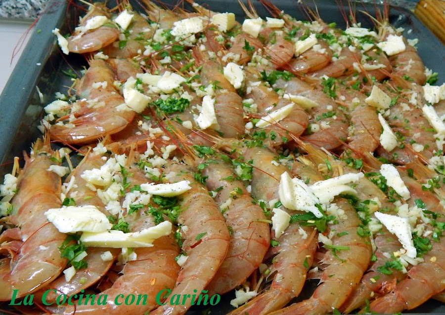 Sobre ella colocamos los gambones, bien ordenados, que nos conocemos, y los rociamos con el resto del ajo, sal y pimienta, el perejil o el cilantro, según decidamos y la guindilla picada. Añadiremos por encima una copa de brandy de Jerez y unos trocitos de mantequilla para que queden brillantes y bonitos.