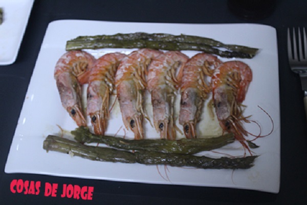 Solo resta esperar a que se terminen de cocer los gambones, calentarse los espárragos y montar el plato.