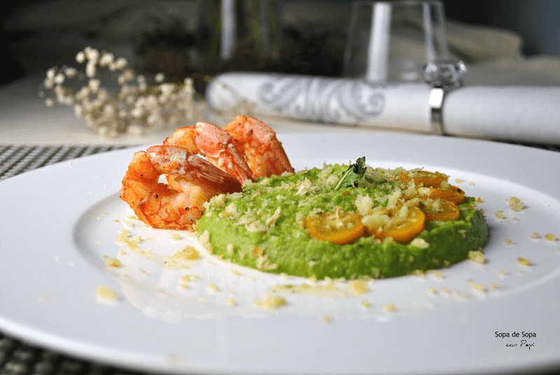 Para servir; Poner en el centro del plato un aro de emplatar y rellenarlo con puré de guisantes. Sacar el aro y colocar encima las rodajas de kumquats, alrededor los gambones y espolvorear el plato con el pan panko.