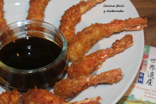 De nuevo con recetas de cocina japonesa. Tengo que reconocer que me enamoré de este país y de su gastronomía, y para que os hagáis adictos a su comida os iré trayendo más recetas y combinando ingredientes suyos y nuestros. También es cierto que hoy día se pueden encontrar casi todo en los supermercados asiáticos. Este plato lo probé en Kyoto pero con langostinos, yo os lo preparo con gambones y queda también muy rico, el éxito de esta receta está en el panko (pan rallado japones) y la salsa tonkatsu, que también se conoce como salsa barbacoa japonesa, que es una variación de la salsa inglesa worcestershire. En otra entrada os explicaré como hacerla de forma casera.