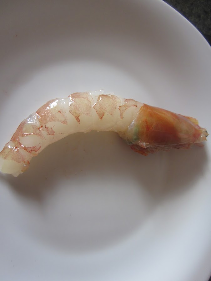 Tenemos que pelar los gambones dejando la cabeza, cortamos con unas tijeras todos los bigotes que tenga, y con ayuda de un palito sacamos el intestino, es tierra y es desagradable comerlo.