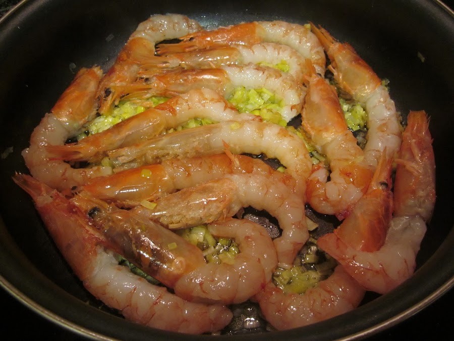 Sofreímos a fuego lento el puerro, la cebolleta muy picadito, una vez pochado, añadimos los gambones salpimentados, dejamos que tomen color, y añadimos el chorreón de coñac, si no nos da miedo, lo flambeamos cuidando que el extractor esté apagado ,es peligroso.
