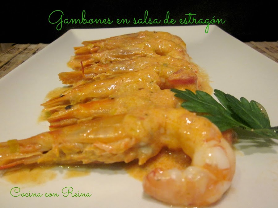 Mezclamos en un bol la nata (crema de leche) junto con el estragón y el tomate frito, y lo añadimos a los gambones,