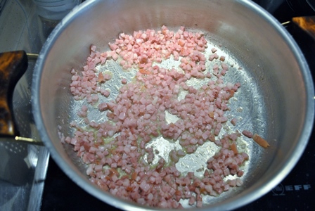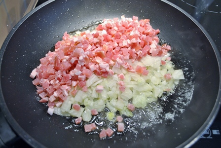 Picar en daditos la cebolla y pocharla en una sartén junto con la panceta en mantequilla.