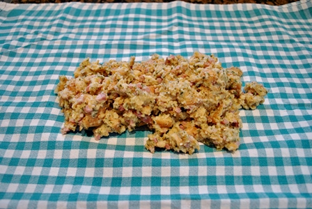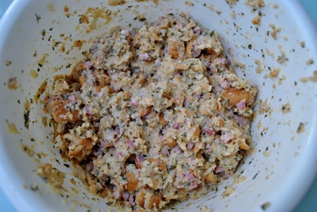 Una vez blandita volcarlo en el cuenco del pan. Sazonar y espolvorear con nuez moscada. Calentar la leche y verterla sobre el pan al igual que los huevos ligeramente batidos. Picar el perejil finamente y echarlo también. Con las manos unimos todos los ingredientes hasta conseguir una masa.