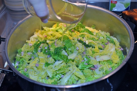 Echar la col y la cebolla, y dejar que se poche suavemente. Añadir el caldo y deja cocer hasta que se haya consumido.