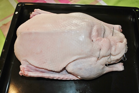 Limpiar bien el ganso de restos de plumas y lavarlo. Después secarlo bastante bien con papel de cocina. Lavar las tres naranjas y pelar el jengibre, picar ambos en daditos y rellenar el ganso con ésto y salpimentar.