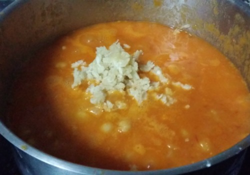 y un poco de caldo de cocer los garbanzos y mezclamos bien.