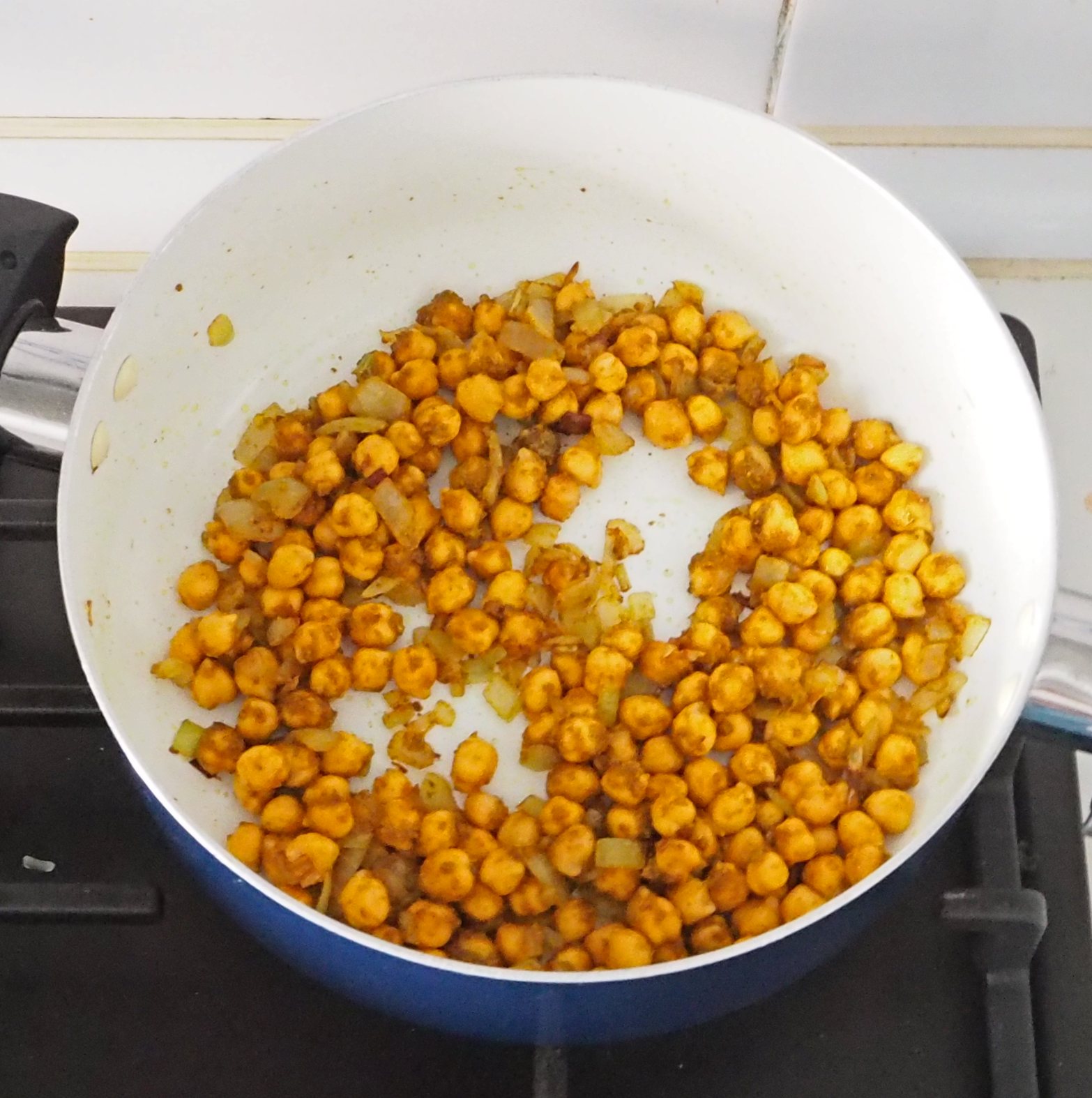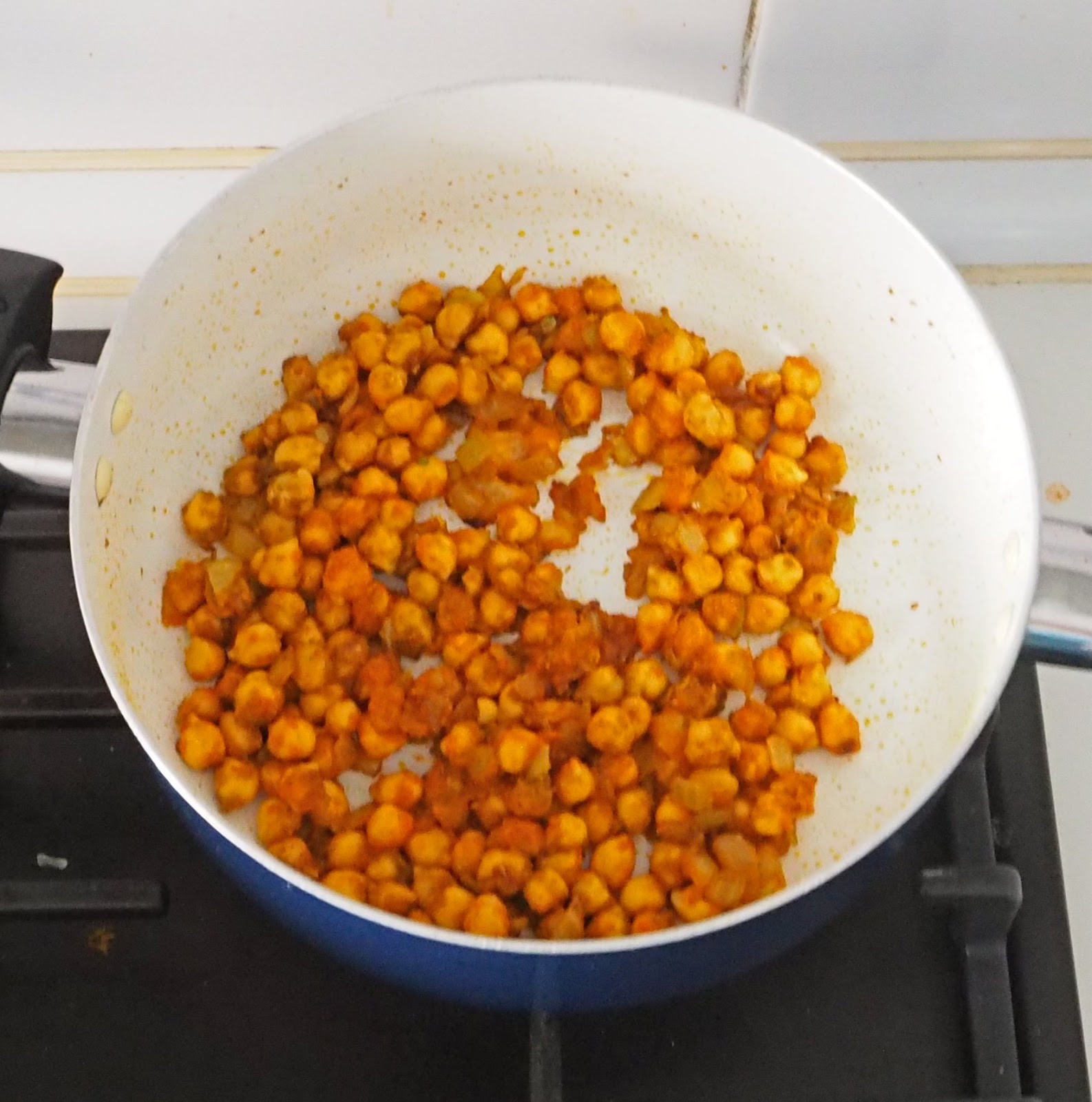 - Mezclamos los garbanzos con el curry en polvo. Que se impregnen bien.