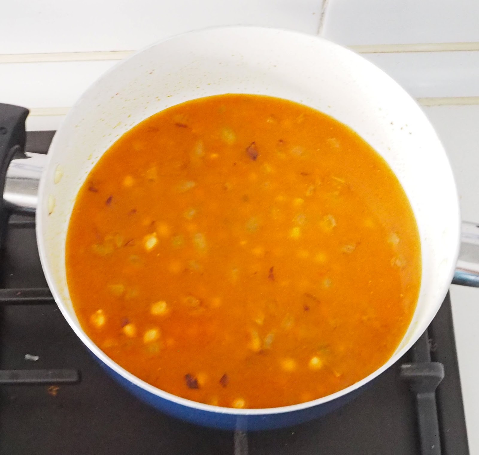 - Añadimos el caldo o agua. Que cubra los garbanzos.