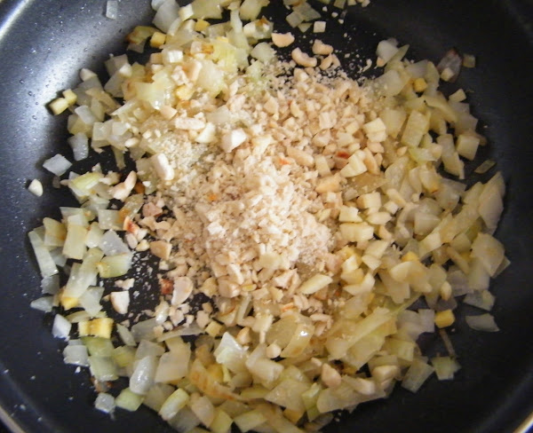 3. Cuando esté tierna, añadimos el jengibre y el ajo picados. Picamos las almendras en un mortero y las incorporamos. Movemos durante un par de minutos.