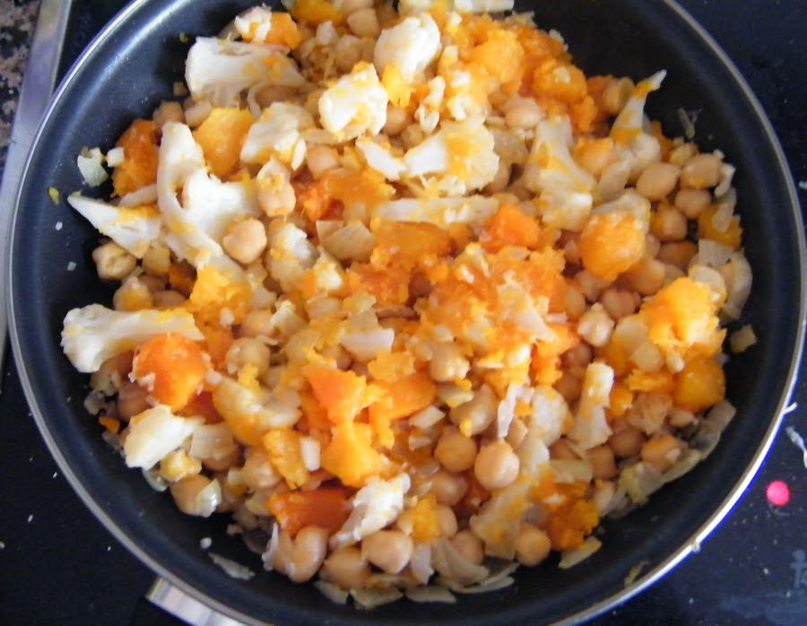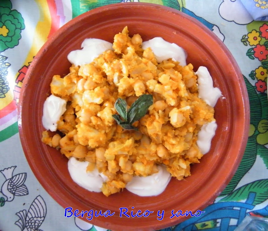 Un sencillo plato vegetariano lleno de proteínas, vitaminas y minerales gracias a los garbanzos acompañados de calabaza y coliflor. Lo hemos comido con refrescante yogur griego. Para 2-3: