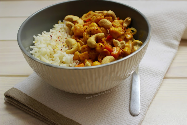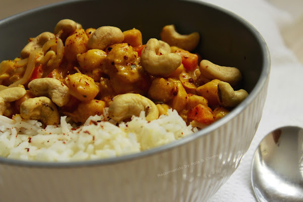 Rectificar la sal y pimienta si es necesario. Añadir anacardos o cacahuetes.