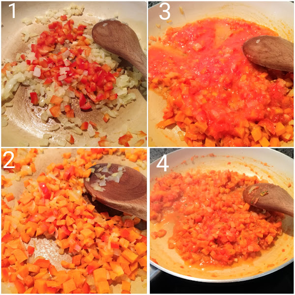 Cortar la cebolla en pequeños cuadrados y sofreír en un sartén con un poco de aceite de oliva hasta que esté transparente.