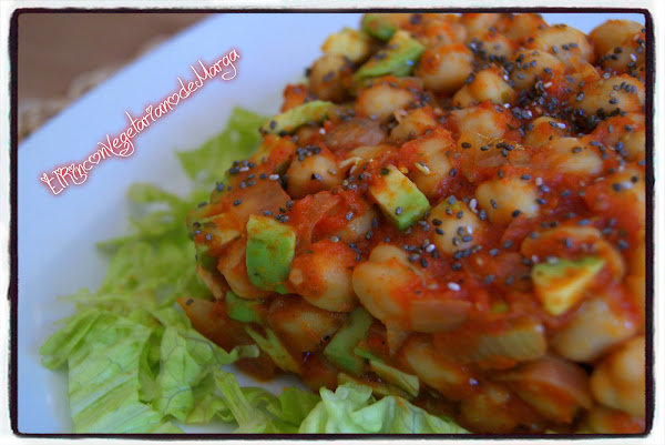 Troceamos la cebolla y el ajo y lo sofreímos a fuego medio hasta que quede pochado, le añadimos un pelín de agua y la salsa de tomate. Dejamos cocinar a fuego lento 10 minutos. Seguidamente le incorporamos el aguacate cortado en dados y dejamos que coja el calor del sofrito. Añadimos las especias y por último los garbanzos cocidos y escurridos. Mezclamos todos los ingredientes y listo para comer.