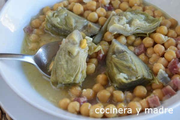 Dificultad: muy fácil Raciones: 4 personas Tiempo: 30 minutosIngredientes de los garbanzos con alcachofas y jamón: