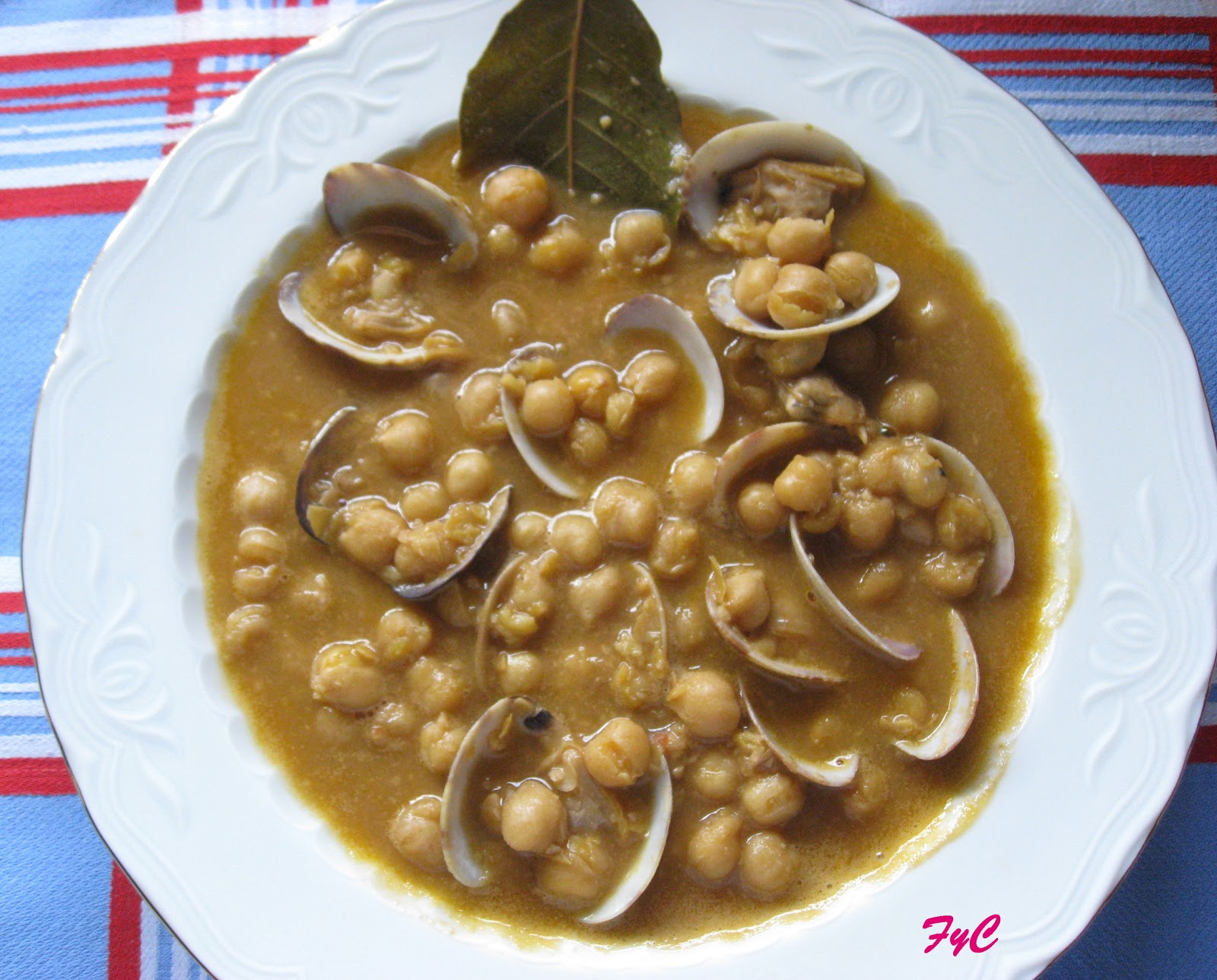 Añadir el tomate rallado, las hojas de laurel y el vino. Dejar que reduzca un poco y evapore el alcohol. Poner un poco de agua y triturar toda la salsa menos las hojas de laurel, echar la pastilla de caldo de pescado, el resto del agua según nos guste de caldoso el guiso, las almejas y los garbanzos que teníamos reservados.