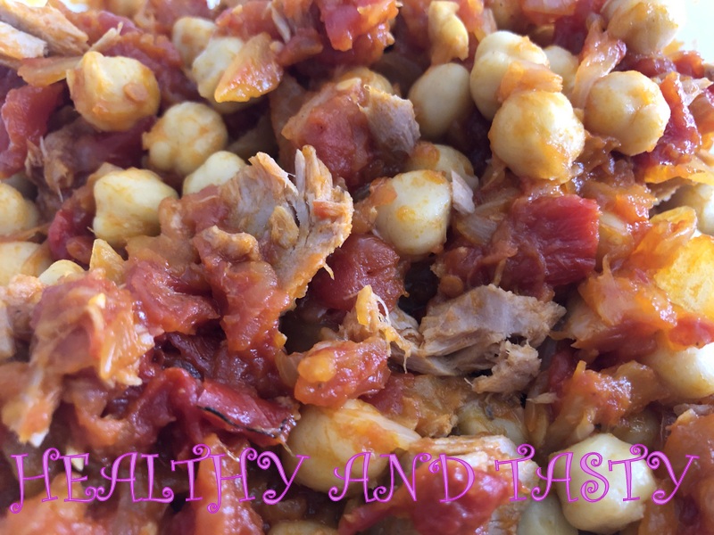 Retiramos el recipiente varoma, echamos los garbanzos en una fuente, agregamos el atún desmenuzados y mezclamos todo con el contenido del vaso de la Thermomix. Servimos inmediatamente caliente. ¡Espero que os gusten!