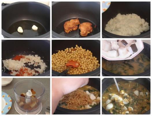 Añadimos la mezcla anterior a los garbanzos con bacalao y espinacas y dejamos que de un hervor.