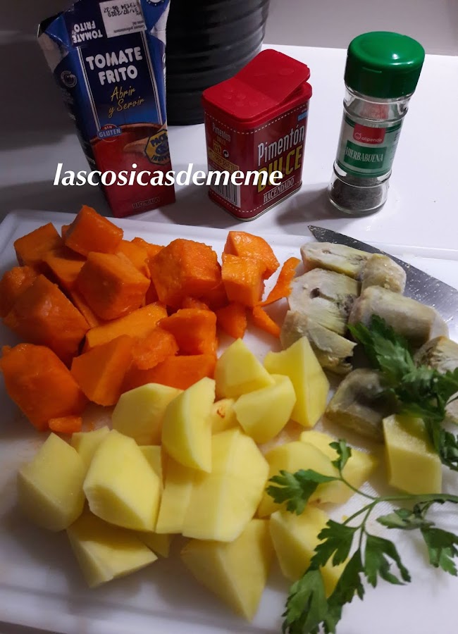 Ponemos la calabaza partida en trocitos, las patatas, las alcachofas, muy peladas, casi dejar solo los cogollos y partidas en cuatro trozos en la olla.