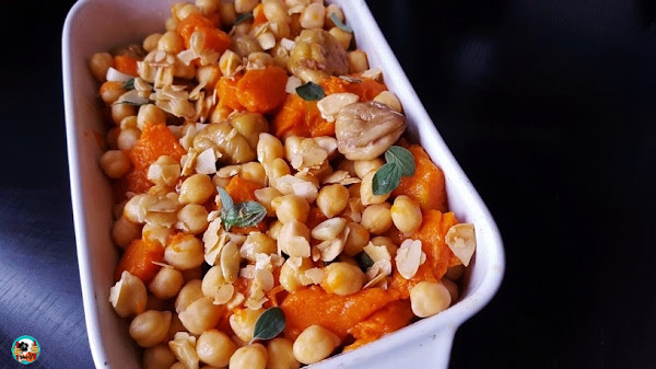 Para hoy tengo una rica olla de verduras de temporada. Unas castañas con garbanzos y calabaza. Si, todavía quedan algunas castañas por ahí..., si tienes la oportunidad de comprarlas en algún puesto castañas asadas, puedes hacer esta rica olla de verduras.