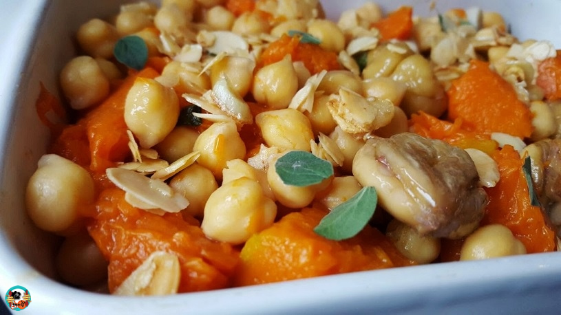 2.-Pelamos la calabaza, la cortamos en trozos medianos y la ponemos a cocer con agua, sal y hoja hoja de laurel hasta que este casi cocida. Pelamos los ajos y los rehogamos en un caldero con la mantequilla y una cucharada de aceite de oliva esta que estén dorados. Añadimos la calabaza cocida, las castañas asadas, abrimos el bote de garbanzos los lavamos y los escurrimos bien. Los incorporamos a la olla, salpimentamos al gusto y le añadimos un poco de orégano fresco. Cocinamos 5 minutos, servimos caliente. Esparcimos por encima un poco de orégano fresco.
