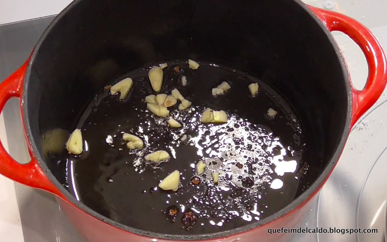 Empleando el mismo aceite y la misma cazuela donde hemos frito los ingredientes para la picada, freímos los 3 dientes de ajo.