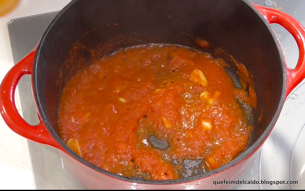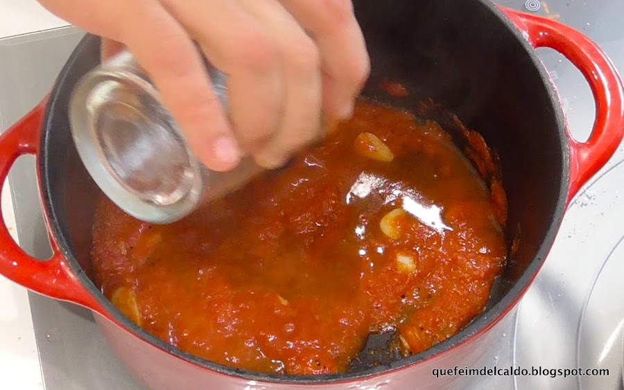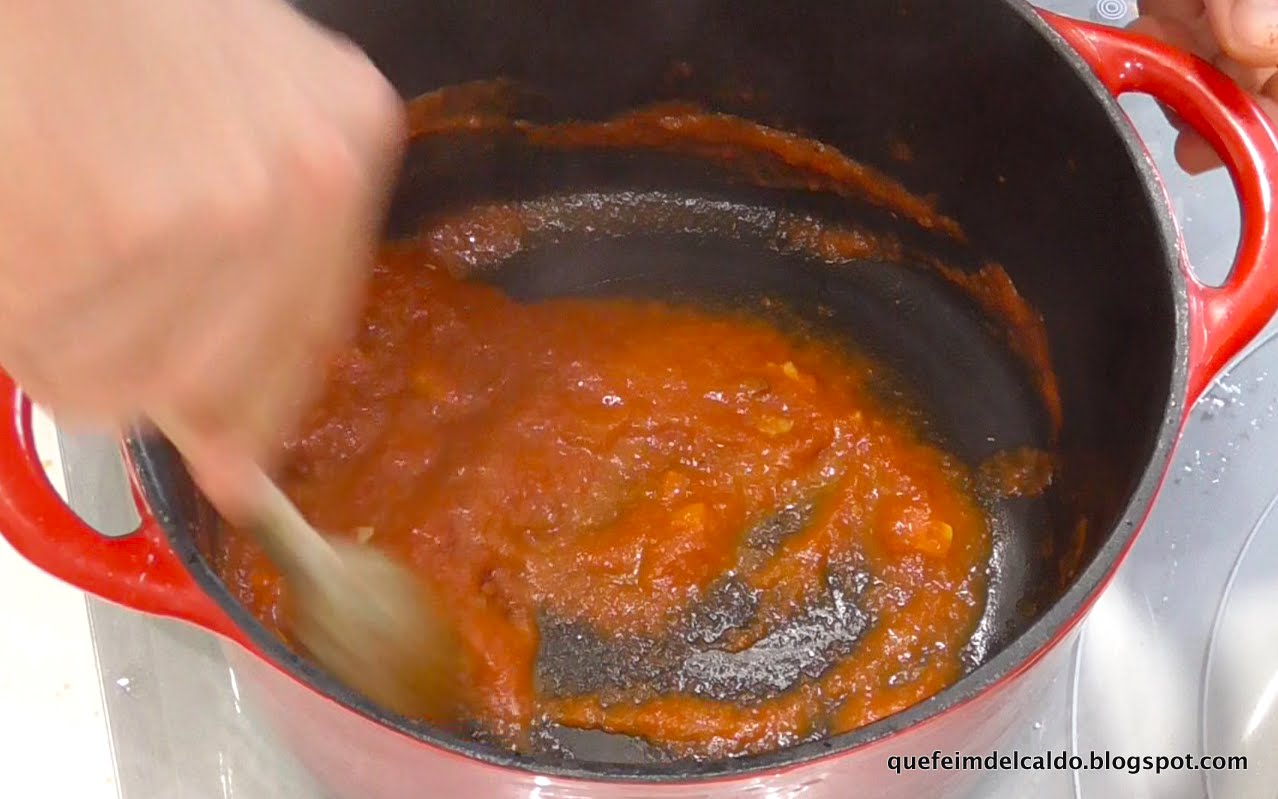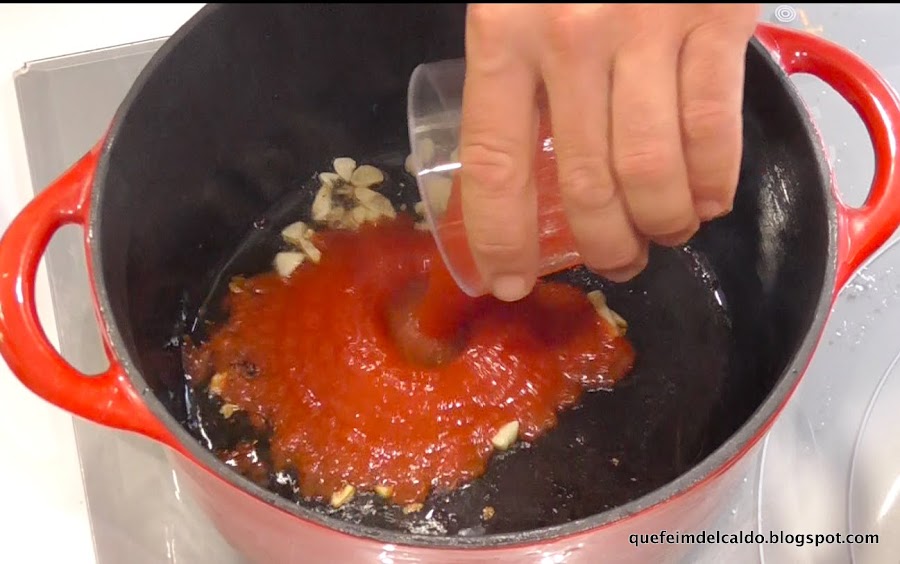 Antes de dorarse incorporamos el tomate triturado, en esta ocasión hemos empleado tomate en conserva.
