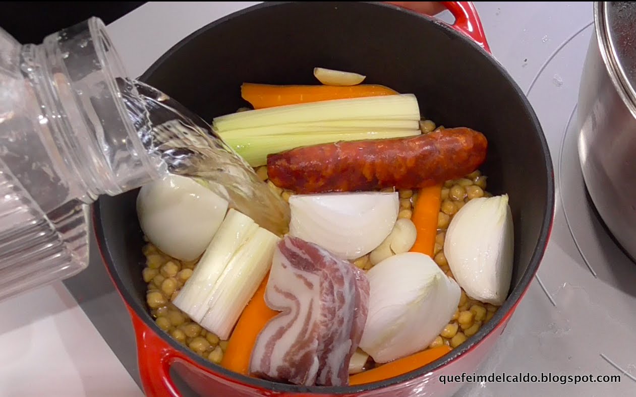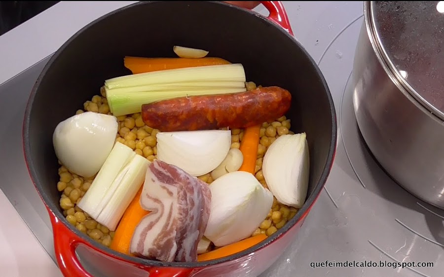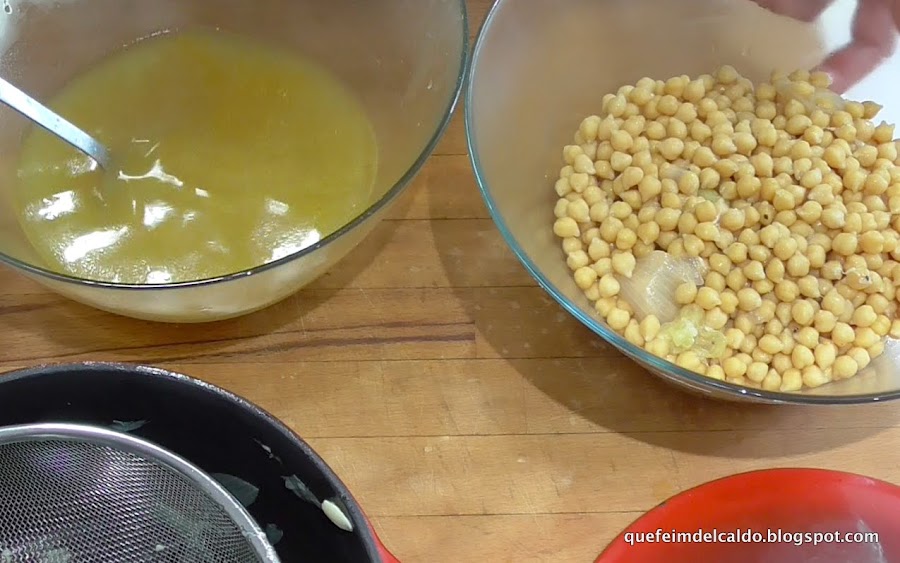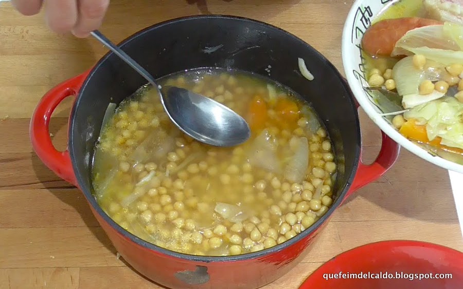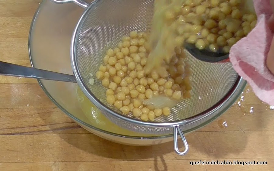 Retiramos de la cazuela la carne y las verduras, dejando sólo los garbanzos y el caldo de cocción.