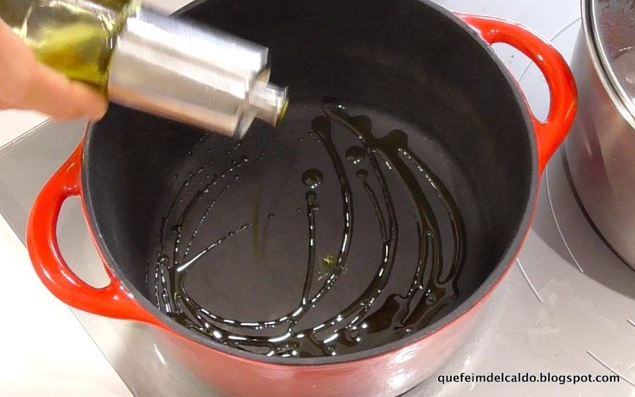 Pasadas ya 10 horas empezamos a cocinar, en primer lugar ponemos en una cazuela un chorro de aceite de oliva, aproximadamente 1 cucharada sopera.