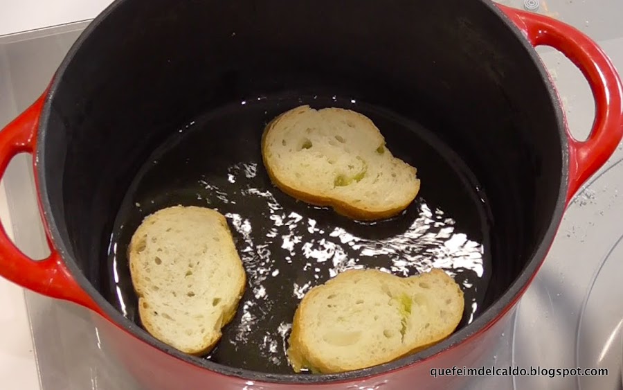 Ahora nos preparamos para hacer la picada, para ello freímos 3 rebanadas de pan de barra.