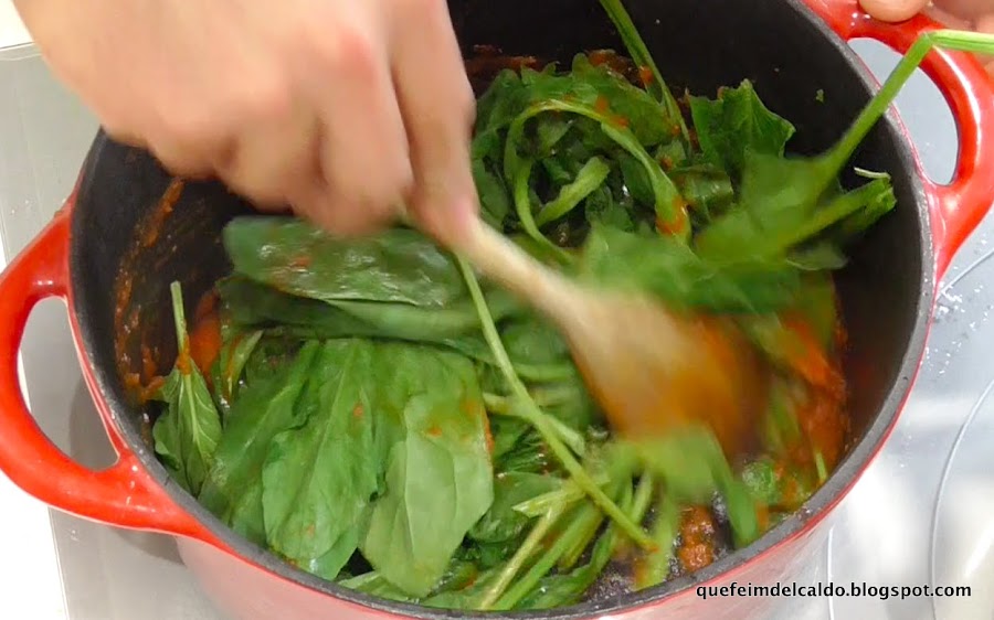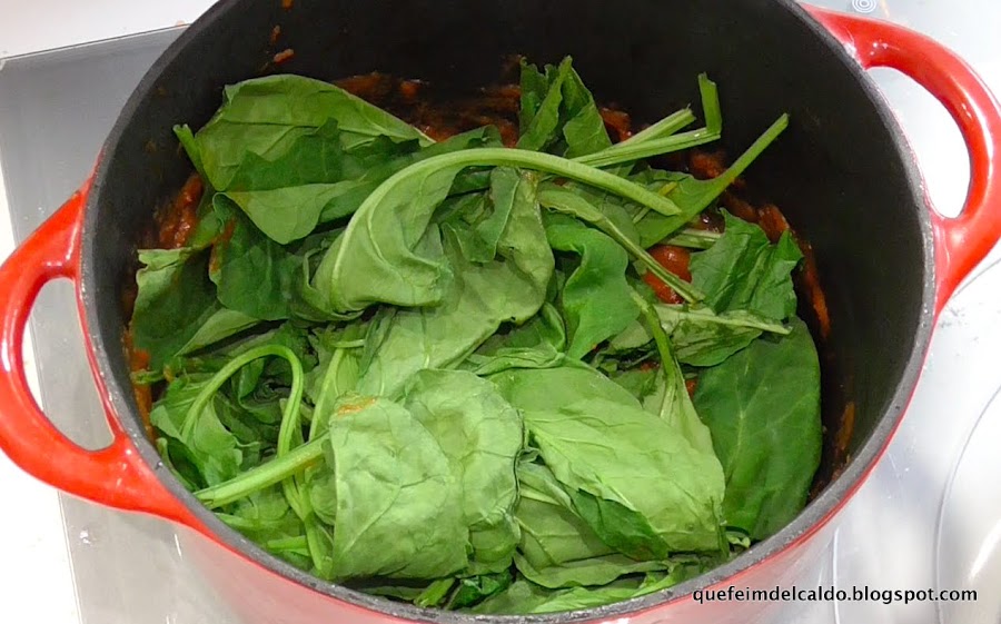 Ahora es el momento de poner las espinacas frescas que previamente hemos lavado, damos potencia al fuego a 6-9.
