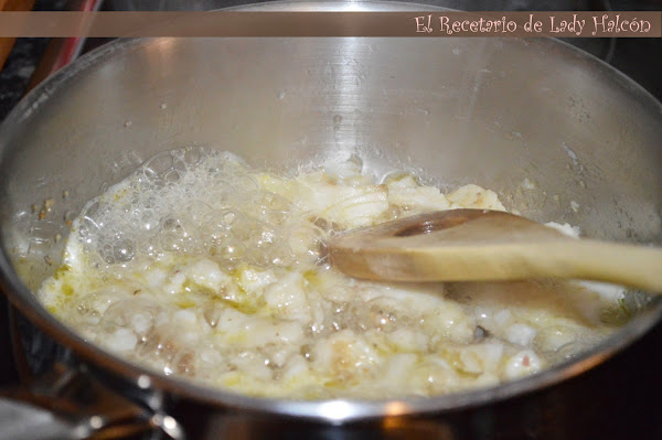 Corta el ajo a rodajas y mételo en el cazo. Cuando empiece a dorarse, añade el bacalao desmigado.