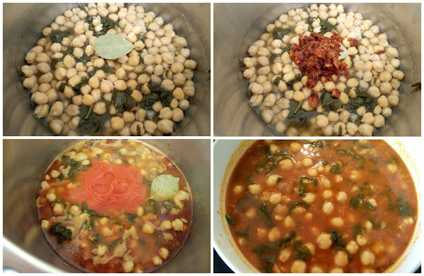 7. Pasado el tiempo, abre la olla y añade la hoja de laurel, el majado y remueve. Después añade el tomate y vuelve a mezclar. Si necesitas añadir más agua, caliéntala en un cazo a parte o en el microondas. Rectifica de sal y deja cocer unos 20 minutos más a fuego bajo. Tapa la olla sin cerrar para que no se evapore el caldo. Al final comprueba que los garbanzos están blanditos y, si no fuera así, deja cocer durante otro rato.
