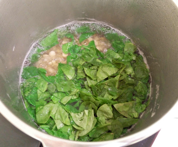 4. Una vez limpia el agua de espuma, añade las espinacas bien lavadas. En mi caso, yo he troceado un poco las hojas para que no quedaran muy largas e incómodas de comer sobretodo para aquellos a los que no les gustan mucho las espinacas. Cocinaremos durante unos 40 minutos (ver los tiempos que indica el envase de los garbanzos).