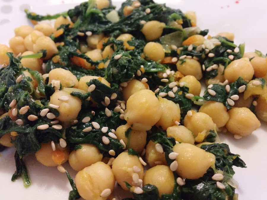 Echamos un chorrito de aceite de oliva en una sartén y sofreímos la cebolla y el ajo, cuando empiecen a dorarse, añadimos la zanahoria cortada como más os guste y, a continuación añadimos las espinacas previamente lavadas y cortadas. Cuando ya casi estén las espinacas, añadimos los garbanzos y salteamos durante unos minutos y cuando apaguemos el fuego, antes de retirar, rociamos con un chorrito de salsa de soja. Luego en el plato, podemos añadir unas semillas de lo que más os guste, yo en este caso, he puesto semillas de sésamo.