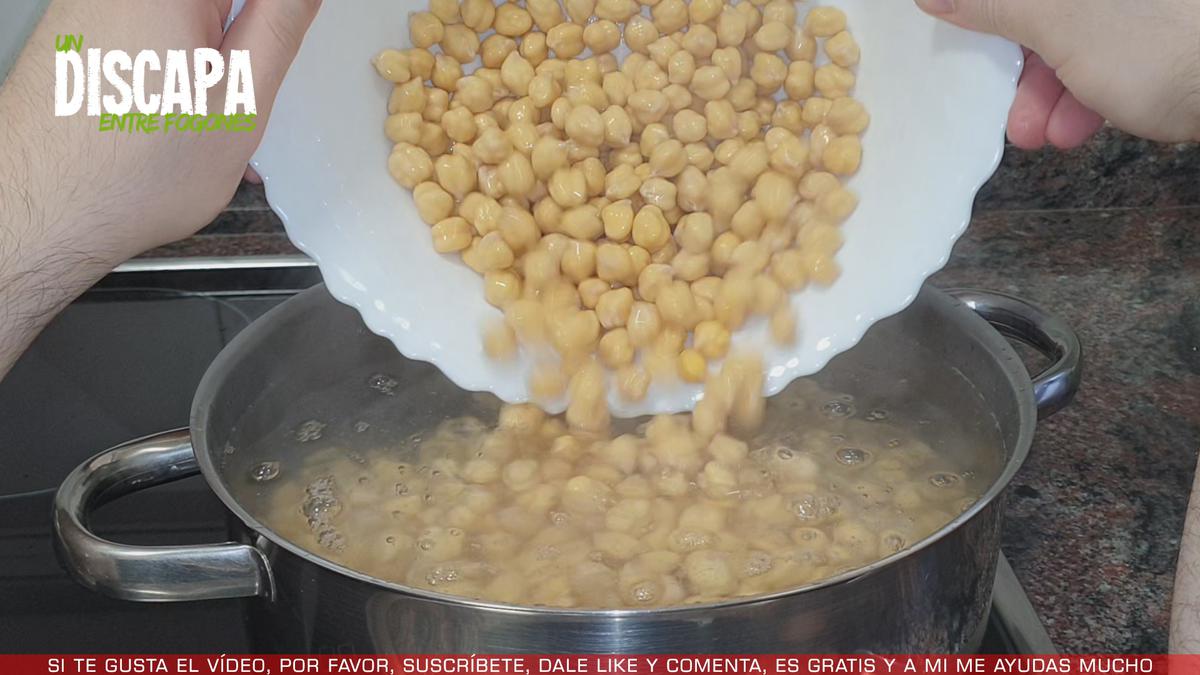2Añadimos en una cazuela abundante agua y cuando empiece a hervir añadimos los garbanzos escurridos.
