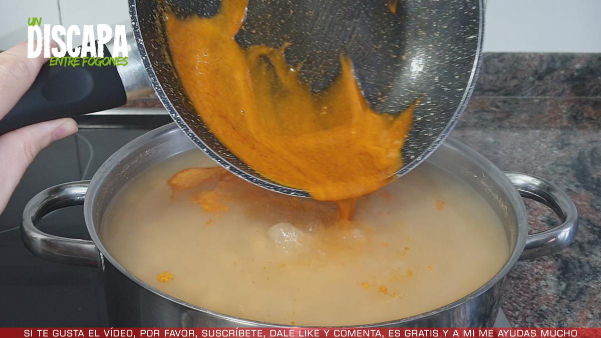 Y ahora añadimos la mezcla a los garbanzos. Haciendo esto conseguiremos que el caldo de los garbanzos tenga más cuerpo y un sabor delicioso.